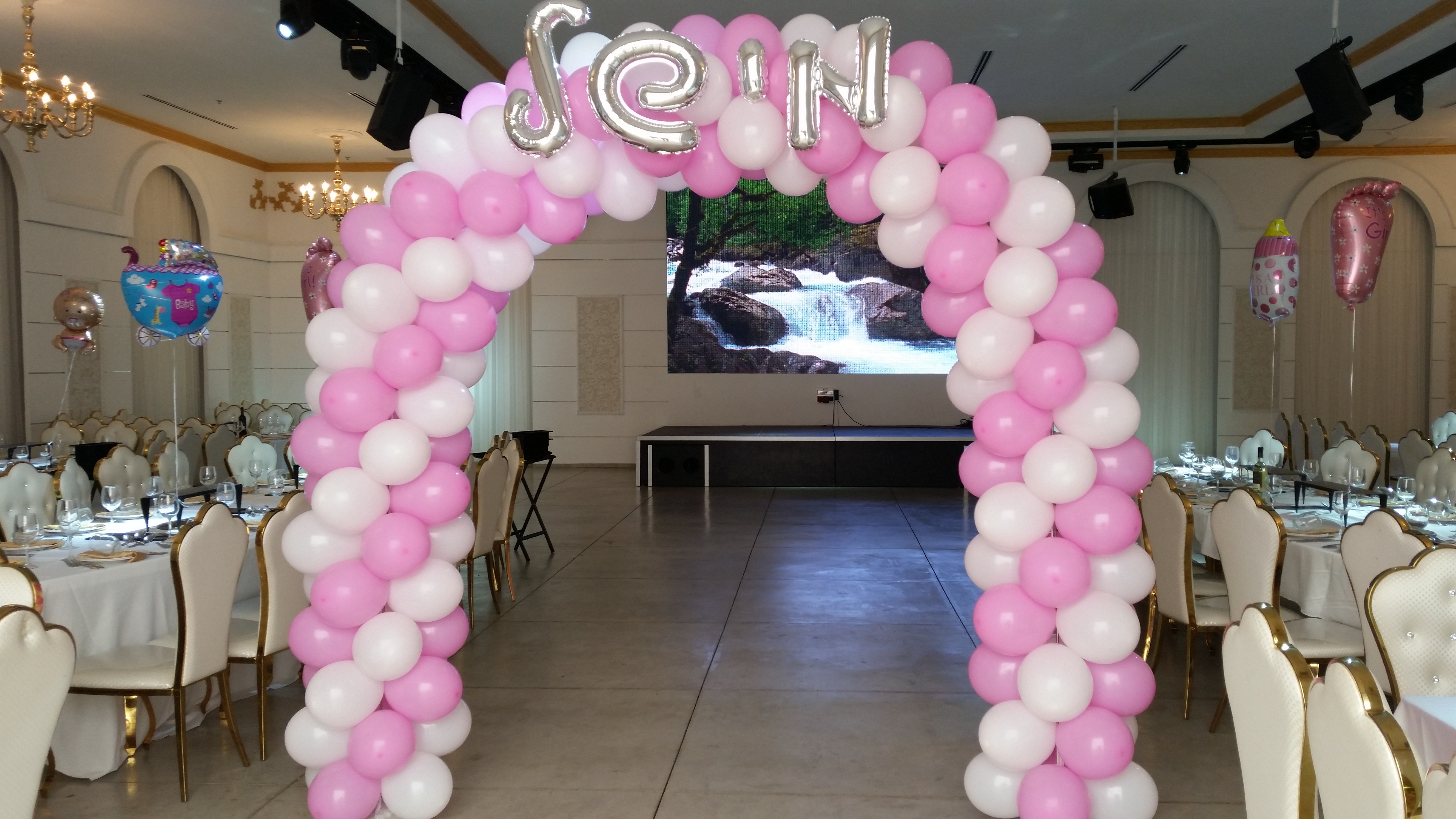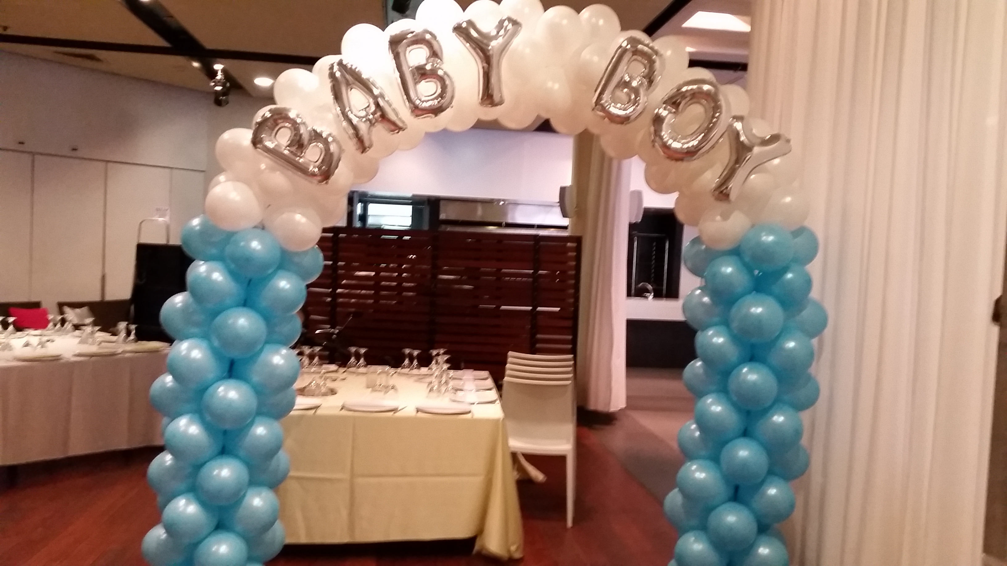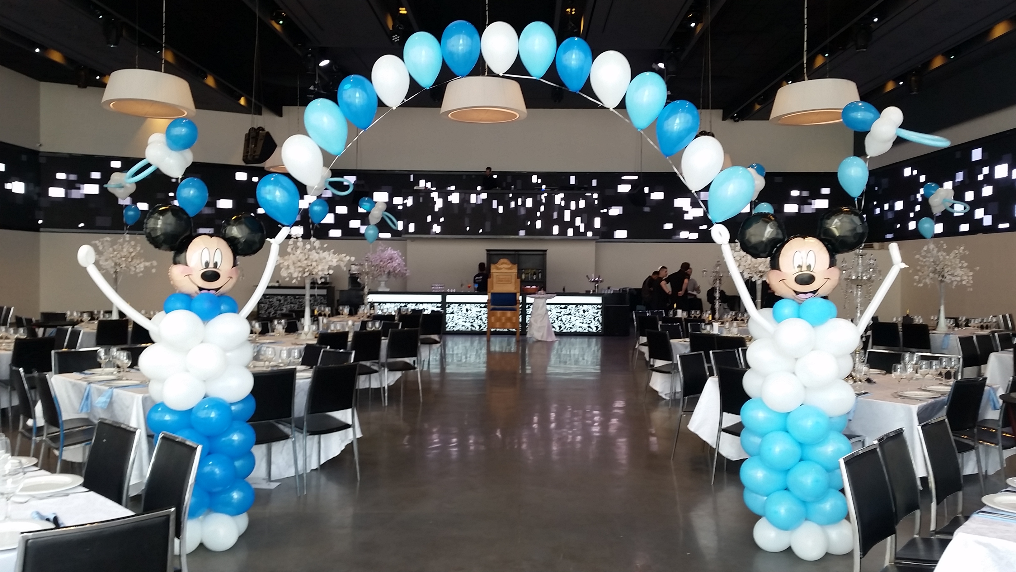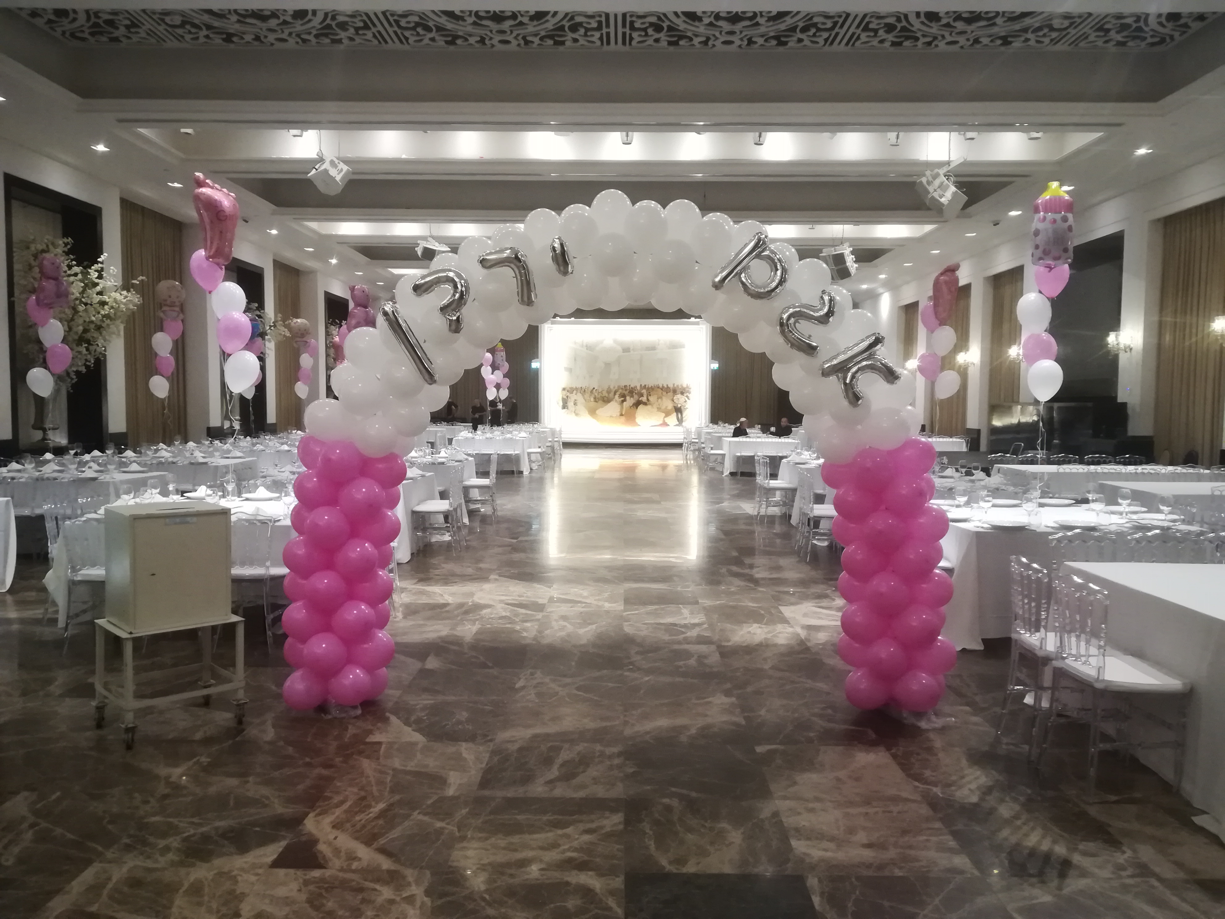 שער בלונים לבריתה צבע לבן וכסףבלונים בשולחנות לבריתבובות בכניסה לבריתהבלונים לאירועים